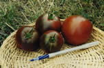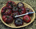 Rare, 3"oval, red/black colour, mid season. Pleasant,tangy sweet smoky flavour. A Popular, productive variety. Indeterminate. Rare.